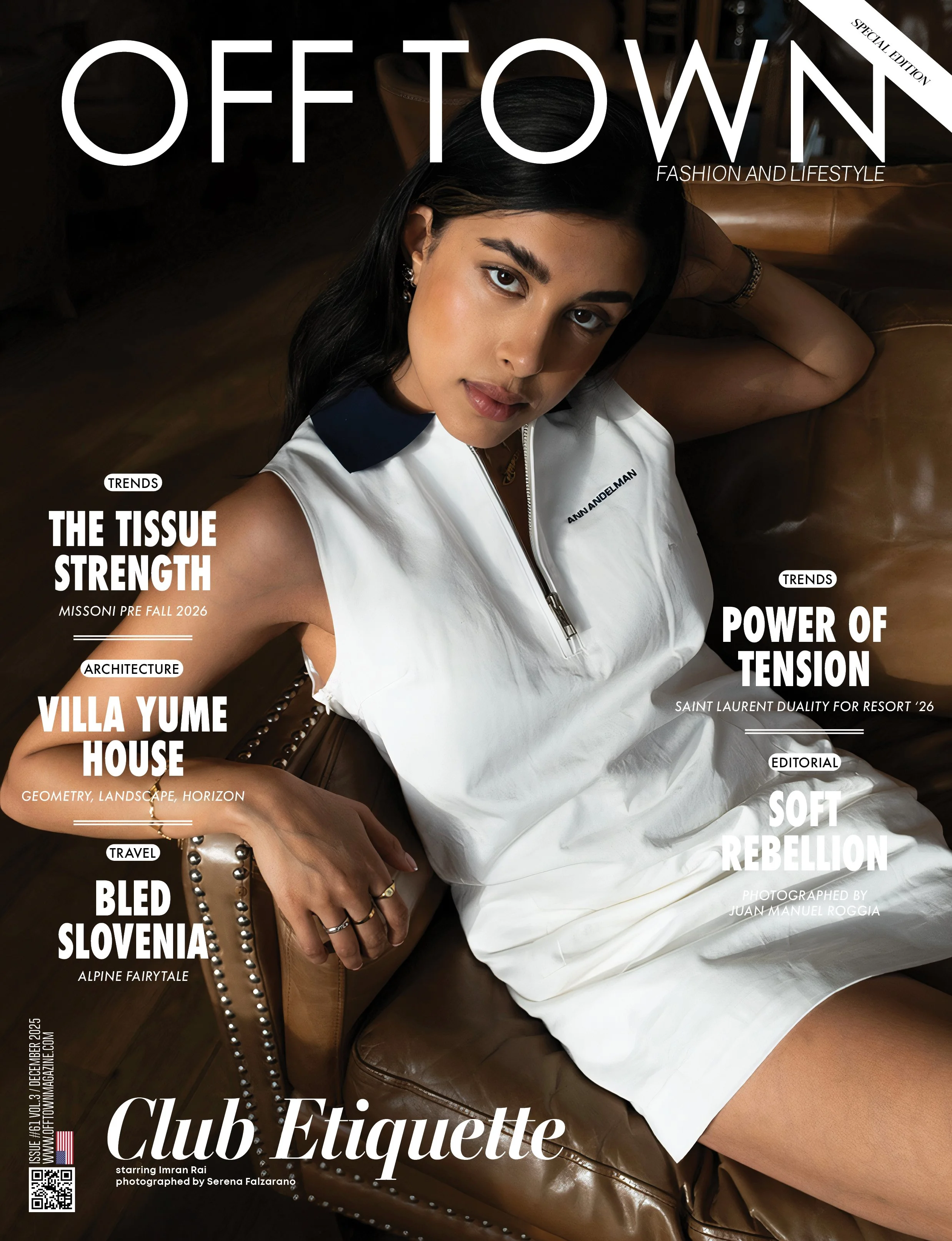 A woman with long, wavy black hair sitting on a green sofa in front of a wooden wall with framed abstract art. She is wearing a cream-colored dress with gold polka dots and a fur vest, and has dark nail polish. There is a vintage turquoise rotary phone on a side table beside her, and orange cushions are on the sofa.